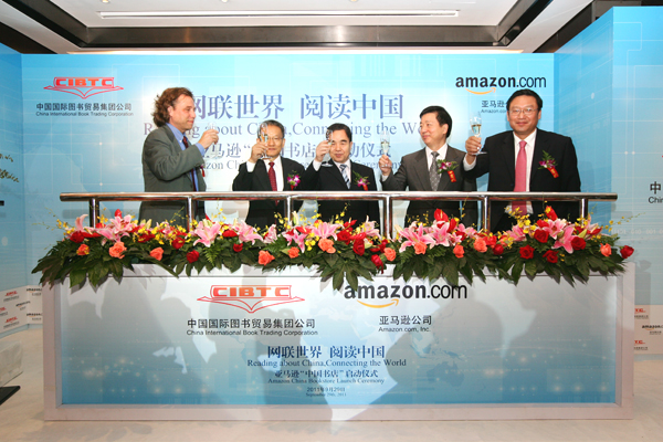 2011年9月29日,國(guó)圖集團(tuán)公司和美國(guó)亞馬遜公司在北京王府井希爾頓酒店隆重舉行亞馬遜“中國(guó)書店”項(xiàng)目啟動(dòng)儀式。國(guó)家新聞出版總署署長(zhǎng)柳斌杰、副署長(zhǎng)鄔書林,中國(guó)外文局局長(zhǎng)周明偉等出席儀式。中央外宣辦三局局長(zhǎng)張雁彬,新聞出版總署對(duì)外交流與合作司司長(zhǎng)張福海,外文局常務(wù)副局長(zhǎng)郭曉勇、副局長(zhǎng)陸彩榮,新聞出版總署對(duì)外交流與合作司副司長(zhǎng)陳英明,海關(guān)總署數(shù)據(jù)中心副總工程師陳輝等參加啟動(dòng)儀式。