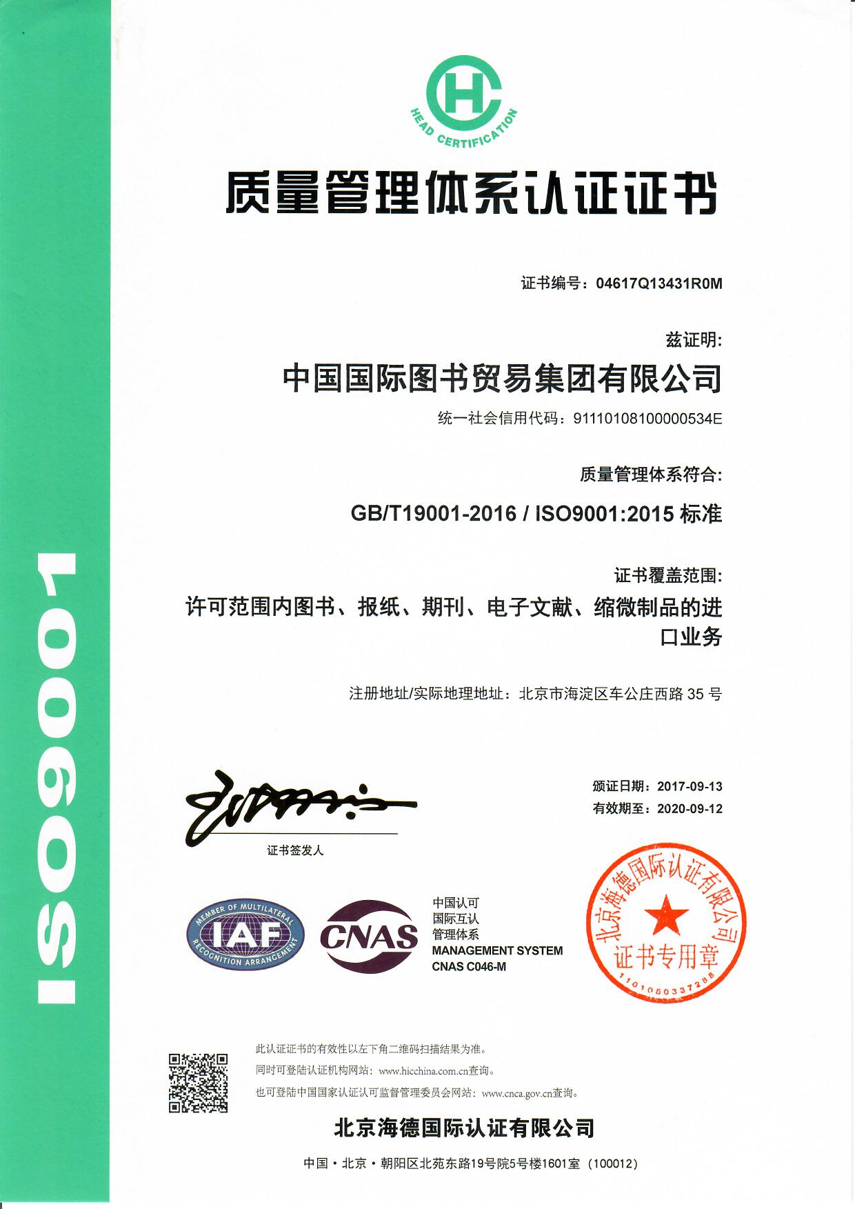 2017年9月,國(guó)圖集團(tuán)公司成功獲得ISO9001國(guó)際質(zhì)量標(biāo)準(zhǔn)體系認(rèn)證。ISO9001質(zhì)量管理體系是ISO組織(國(guó)際標(biāo)準(zhǔn)化組織)頒布的影響面最廣的一個(gè)管理體系標(biāo)準(zhǔn),是迄今為止世界上最成熟的質(zhì)量框架,不僅為質(zhì)量管理體系,也為總體管理體系設(shè)立標(biāo)準(zhǔn)。國(guó)圖集團(tuán)公司引入ISO9001質(zhì)量管理標(biāo)準(zhǔn),實(shí)現(xiàn)了傳統(tǒng)圖書貿(mào)易企業(yè)與國(guó)際先進(jìn)管理制度、機(jī)制的對(duì)接,不僅有助于樹立現(xiàn)代管理理念,提升經(jīng)營(yíng)水平,降低生產(chǎn)和運(yùn)營(yíng)成本,擴(kuò)大品牌認(rèn)同和市場(chǎng)占有率,更為集團(tuán)公司實(shí)施“走出去”戰(zhàn)略,參與國(guó)際交流與競(jìng)爭(zhēng)提供了一張質(zhì)量“通行證”。